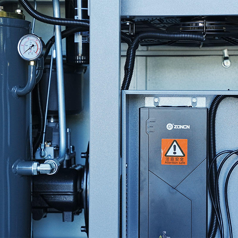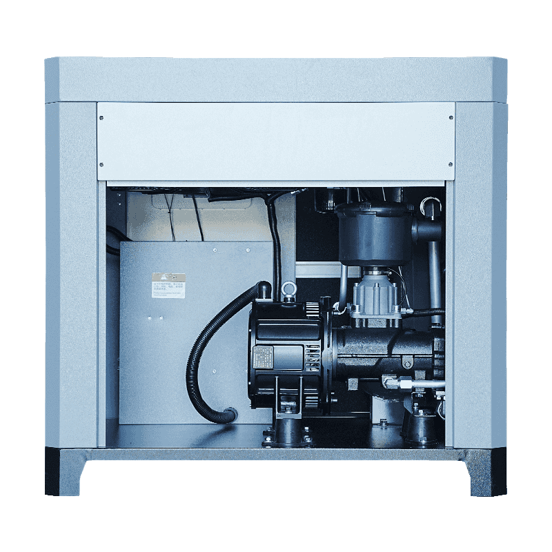 Der einstufige 30-PS-Mikroöl-Doppelschneckenkompressor verfügt über einen Permanentmagnet-Synchronmotor mit Schutz vor geringem Temperaturanstieg und ein Frequenzumwandlungssteuerungssystem, die beide die Vibrationseigenschaften beeinflussen. Die direkte und effiziente Interaktion zwischen Motor und Schraubenrotor sorgt für eine reibungslose Drehmomentübertragung und reduziert gleichzeitig mechanische Schwingungen beim Anfahren, Betrieb oder Abbremsen. Darüber hinaus ermöglicht die Frequenzumwandlungstechnologie ein schrittweises Beschleunigen und Abbremsen der Maschine, wodurch plötzliche Drehmomentspitzen minimiert werden, die unerwünschte Vibrationen verursachen können. Das Mikroölschmiersystem stabilisiert interne Komponenten zusätzlich, indem es die Reibung zwischen beweglichen Teilen verringert. Obwohl in bestimmten Umgebungen möglicherweise weiterhin externe vibrationsabsorbierende Strukturen erforderlich sind, bietet die interne Architektur des Kompressors bereits eine Grundlage für einen ausgeglichenen und gleichmäßigen Betrieb.